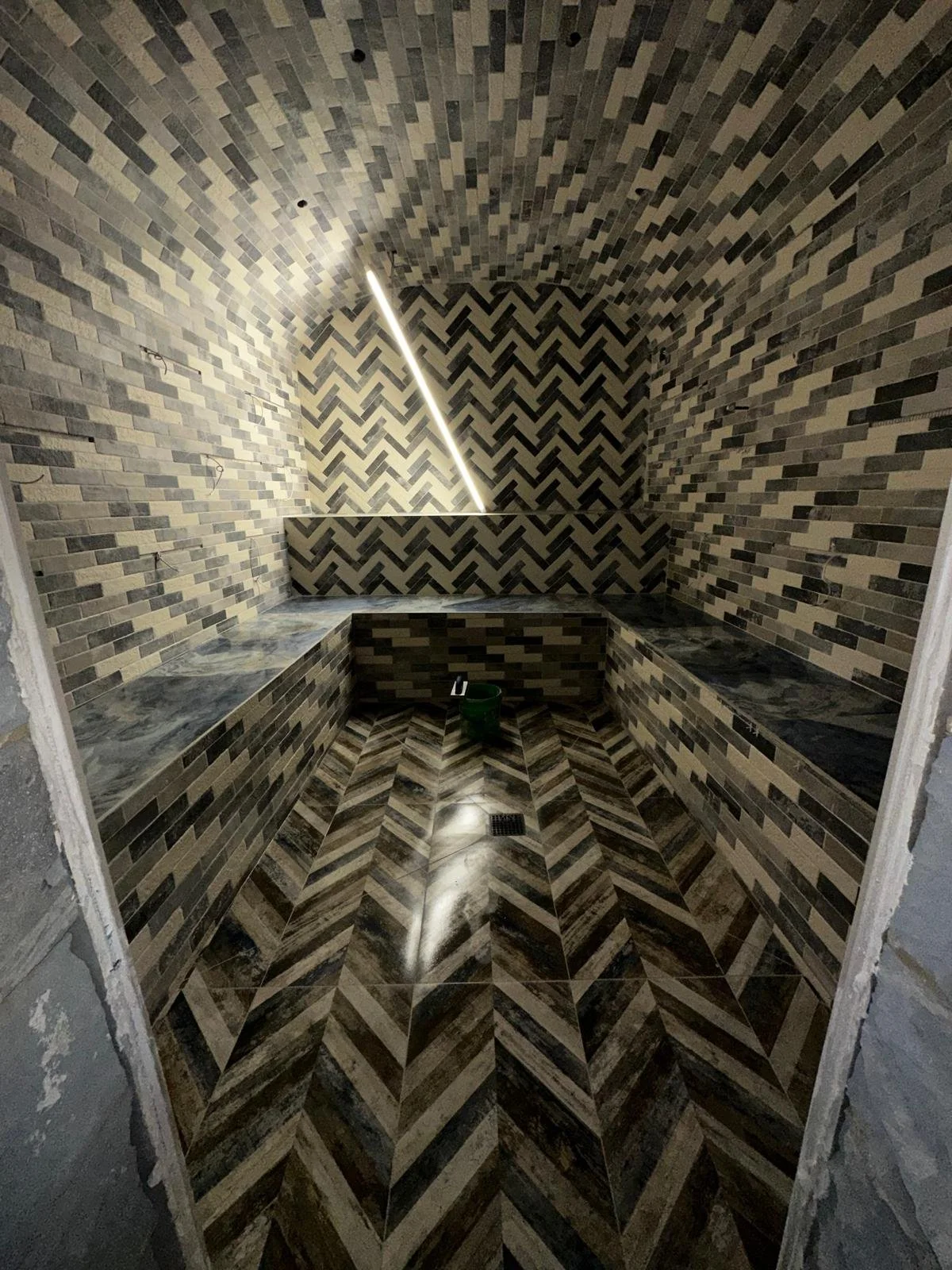 Custom-built steam room fully tiled throughout, incorporating a complete waterproofing and tanking system suitable for high-moisture environments. All finishes and detailing were executed to ensure long-term durability and performance.